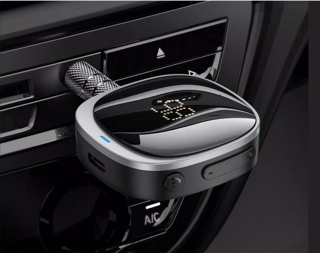 Hoco E80 Bluetooth receiver with 3.5 mm Mini Jack audio plug disconnected. It has a display and a built-in battery. It allows you to make phone calls as a hands-free set.
