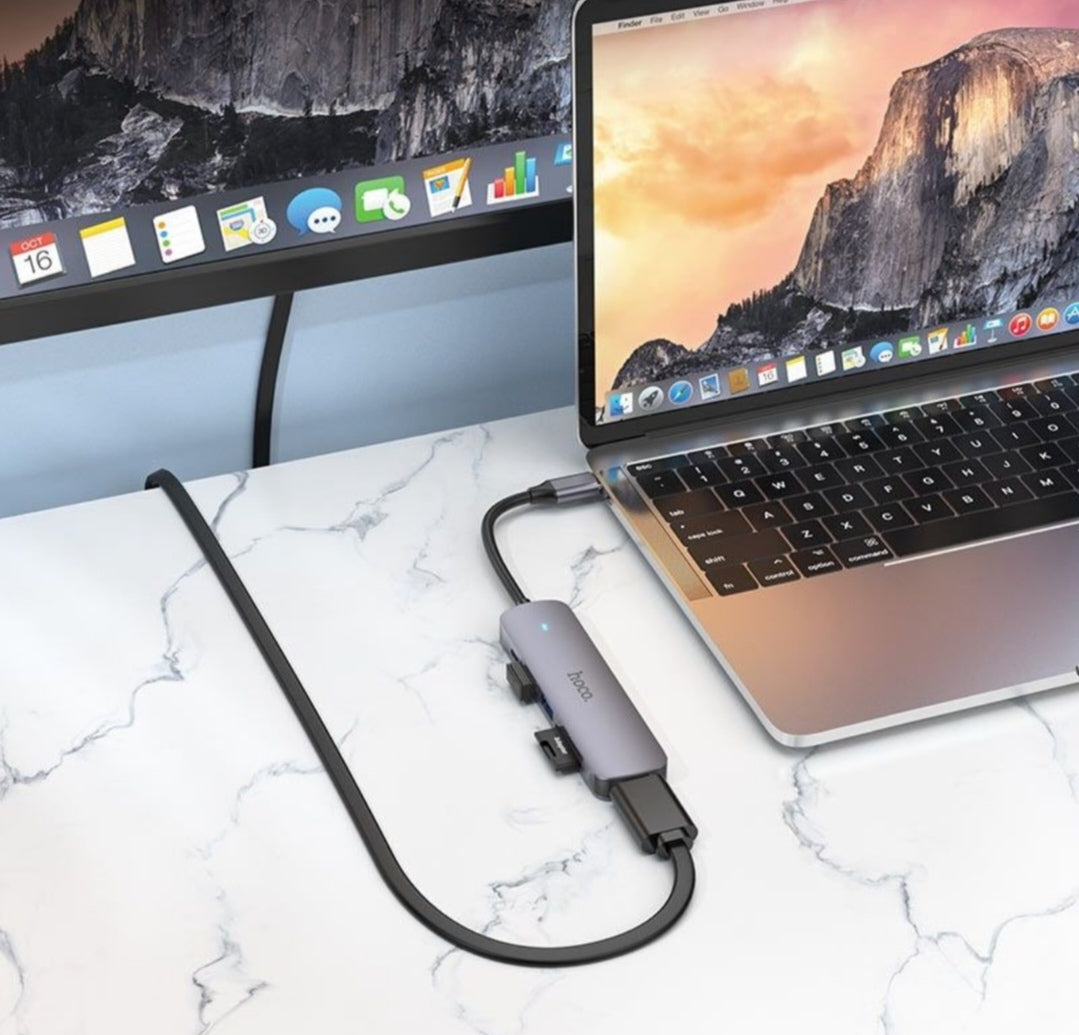 USB hub adapter 6-in-1 HOCO HB28 Type-C to HDMI+PD+USB3.0+USB2.0+SD+TF gray. Hub material: aluminum alloy + ABS. Size: 109x28.8x11.6 mm. Cable length: 135 4mm. Weight: 45 g. Interface: Type-C plug to HDMI + PD + USB3.0 + USB2.0 + SD + TF. Supports 4K 30Hz resolution. Type-C PD supports charging up to 60W (20V/3A) and data transfer. SD / TF 2.0 card reader (simultaneous reading is not supported). Support OTG function for some Type-C phones and tablets. Connect your laptop to an HDTV/projector/monitor (compatible with most operating systems, such as Windows and Mac OS).
